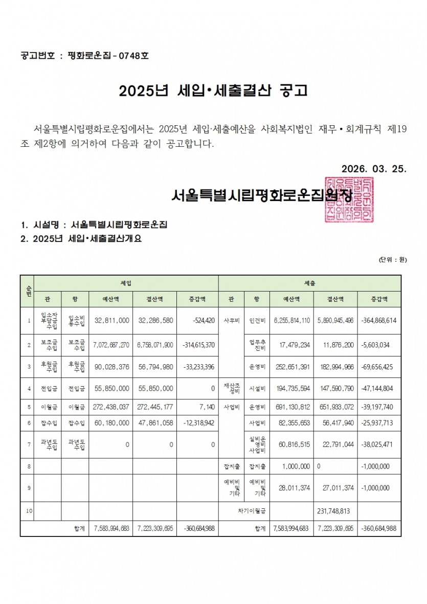 2025년 세입 세출 결산서 공고 페이지 정보 작성자 한동주 작성일 26-03-25 16:42 조회 23회 댓글 0건 첨부파일 파일 홈페이지 세입.세출견결산공고.pdf (58.6K) 2회 다운로드 DATE : 2026-03-25 16:42:12 본문 2025년 세입세출 결산서를 붙임과 같이 공고합니다. 이전글 다음글 목록 답변