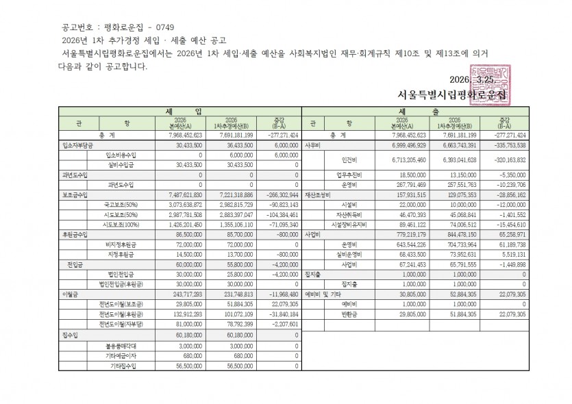 2026년 1차 추가경정 예산 공고 페이지 정보 작성자 한동주 작성일 26-03-25 16:51 조회 41회 댓글 0건 첨부파일 파일 홈페이지공고 .pdf (75.1K) 2회 다운로드 DATE : 2026-03-25 16:51:20 본문 이전글 다음글 목록 답변