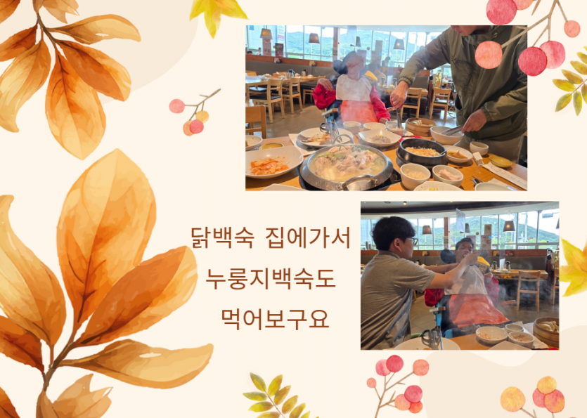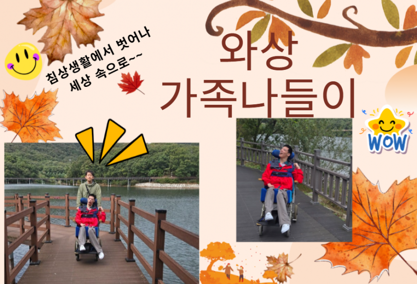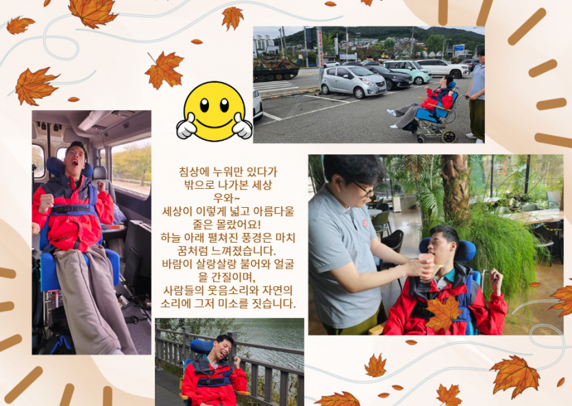 거주인 이야기 | 2025 와상 가족 나들이 페이지 정보 작성자 장설궁 작성일 25-10-30 09:41 조회 562회 댓글 0건 본문 와상가족나들이 침상에서만 지내다 첫 외출을 합니다.선생님들과 함께 바깥으로 나서는 순간, 상쾌한 바람이 얼굴을 스치니 웃음이 절로 납니다.오랜만에 보는 주변의 풍경은 새롭게만 느껴집니다.오늘의 나들이는 오래도록 기억될 소중한 시간이 되었습니다. 감사합니다. 이전글 다음글 목록