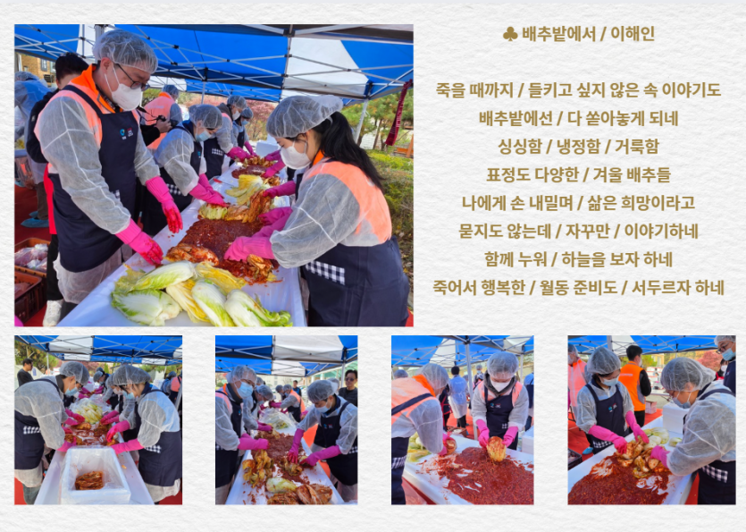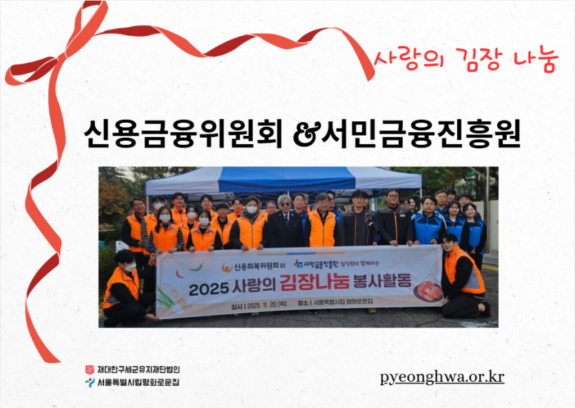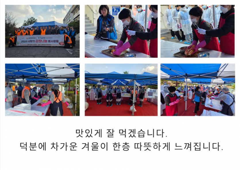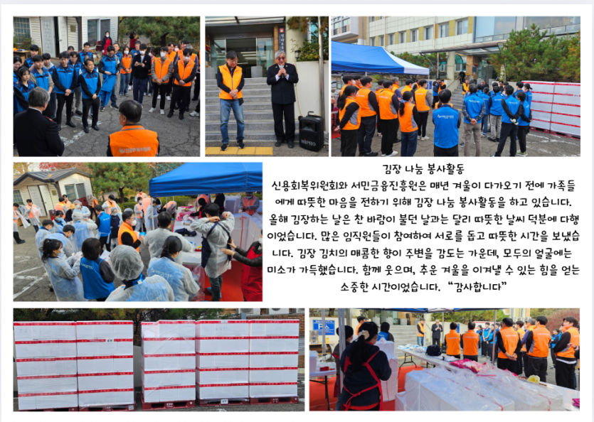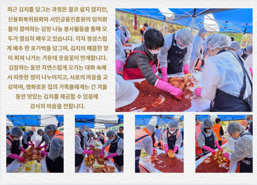후원자·봉사자 이야기 | 신용회복위원회와 서민금융진흥원과 함께 하는 김장 페이지 정보 작성자 장설궁 작성일 25-11-26 11:16 조회 205회 댓글 0건 본문 신용회복위원회와 서민금융진흥원과 함께한 김장임직원분들께서 직접 김치를 담으며 가족분들이 겨울에 맛있게 드신다는 생각에 한 포기 한 포기 정성을 담아따뜻한 마음을 전해주셨습니다. 이 김치가 식탁에 오를 때마다 사랑이 깃든 이 따스함을잊지 않겠습니다. 함께해 주신 모든 분들께 다시 한 번 깊은 감사를 드립니다.고맙습니다.감사합니다. 이전글 다음글 목록