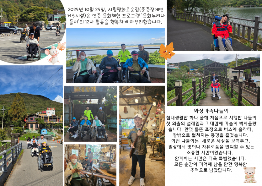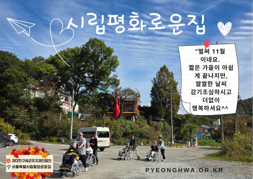 2025년 시립평화로운집 11월 후원감사편지 페이지 정보 작성자 장설궁 작성일 25-11-11 16:11 조회 250회 댓글 0건 본문 11월은좋은 일들은 1과 1사이에 +가 돼서2배가 되고나쁜 일들은 1과 1사이에 -가 돼서0이 됐으면 좋겠다.가을 하늘 아래선아무 이유 없이 기분이 좋아지지 않나요?커피 향 속에서마음도 조금 더 따뜻해졌으면 해요 다음글 목록