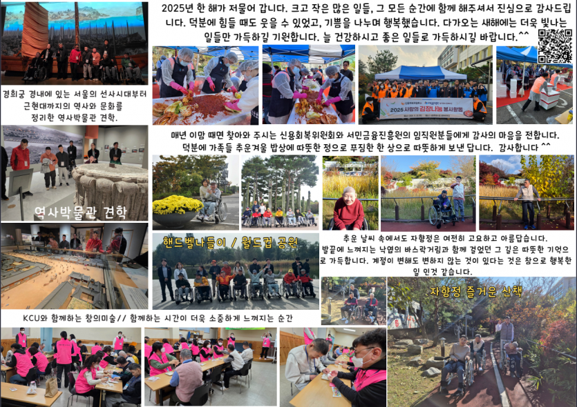 2025년 시립평화로운집 12월 후원감사편지 페이지 정보 작성자 장설궁 작성일 26-01-04 09:46 조회 188회 댓글 0건 본문 어느덧 마지막 달이 되었네요올해 저히에게 찾아온 소중한 인연에 깊이 감사드립니다.남은 한 달도 행복한 추억 많이 만드시길 바라며,다가오는 2026년에는 더욱 멋진 일들로 가득하시길 응원하겠습니다. 이전글 다음글 목록